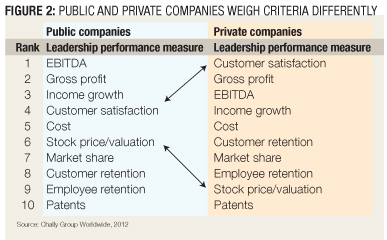 The 2011 Global Leadership Research Project looked into high turnover amongst top leadership worldwide and found that public companies experience a higher rate of CEO turnover than private companies in part because public CEOs are subject to a wider variety of issues and constraints, including a more complex operating environment that includes accountability demands of Wall Street analysts, public opinion and a variety of stakeholders (Figure 2).