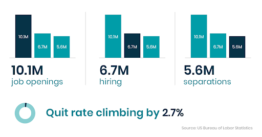 • According to a U.S. Bureau of Labor Statistics June report, there were 10.1 million job openings, with 6.7 million hires, 5.6 million separations and a quit rate that increased  2.7 percent.
