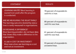Over time, we have collected data at the beginning of conference presentations and webinars by asking our audiences for levels of agreement with four critical statements. L&D professionals have provided some very candid answers, particularly when providing this data anonymously. We asked participants if the statement is mostly true or mostly false. Here are the results.